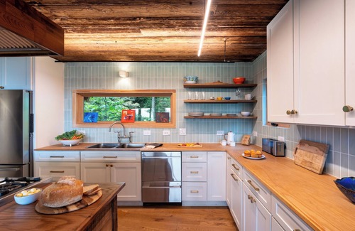 The primary bedroom offers a queen bed and a private ensuite that includes a steam shower for a spa-like experience right at home. A second bedroom with a queen bed is styled with chic decor and tranquil garden views. The bright loft houses a queen bed in an airy, whitewashed space with vaulted ceilings and skylights, making it an inviting hideaway for extra guests.