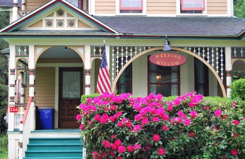 Weeping Willow is an 1895 Historic Queen Anne with 12 zone heating system, rocking chair porch, deep green mountain views, safe walk to Village pool, tennis courts, soccer, baseball field, basketball, horseshoes, and a local period museum, Village library, fall foliage, bubbling Bushkill Creek, and antique shopping. This meticulously restored 'painted lady' is just two miles to Belleayre Mountain (downhill and cross country skiing, music festivals, Pine Hill beach, hunting, Esopus Creek Fly fishing, tubing, Hanah Country Club golf, horseback riding, hiking and biking trails) and is centrally and conveniently located in the Catskills Park in the four season resort Village of Fleischmanns, Delaware County, NY. Relax in a classic parlor with antique ceiling fan, a cozy fireplace and a 32" HDTV and a 55" HDTV in the double sized family room. Host in a formal dining room with candy stripe wood floors, butler pantry, wet bar and wine cooler. Cook in a modern and well equipped professional Viking kitchen with granite counter tops or enjoy the deck with a propane or charcoal BBQ. The rear yard has a large deck with lots of group activities, such as a Bocci Court, Firepit, bow and arrow targets and hatchet throwing target and Native American Sweatlodge.
