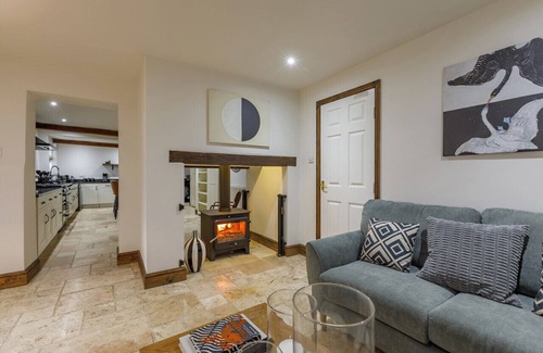 The sitting room is to the left of the front door with a huge log burner, large 55 inch tv on the wall and 3 large sofas easily seating 10 people.