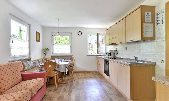 "Cecilia", 3-room apartment 52 m2 on 2 levels, on the ground floor, north-east facing position. Cosy and wooden furniture furnishings: 1 double bedroom. 1 room with 2 beds (80 cm). Shower/bidet/WC. Upper floor: kitchen-/living room (oven, dishwasher, 4 ceramic glass hob hotplates, toaster, kettle, microwave, electric coffee machine) with dining nook and satellite TV. Exit to the balcony. Shower/bidet/WC. Oil heating. Balcony. Balcony furniture. Facilities: washing machine, safe, iron, baby cot, hair dryer. Internet (WiFi, free). Please note: non-smokers only. Maximum 1 pet/ dog allowed. IT022113C2NBNNV7XL