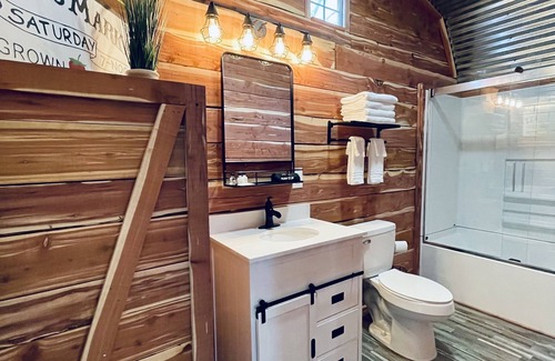 Cedar Bluff is a quaint, open concept cabin with one, fully-adjustable, king size bed (with LED lighting and Bluetooth speakers!). A "tree house" loft with a full size mattress, for our younger guests, is easily accessed by a ladder with handles. There is a cozy breakfast nook with assorted prepackaged breakfast snacks, Keurig coffee maker, K-Cups and condiments. A mini fridge is available for your use, as well. There is a full bathroom with shower and bathtub. A Roku TV and high speed, free guest Wi-Fi are available for your convenience. Outside, there is a large deck overlooking a serene pond with a private hot tub, outdoor shower and fire pit area with porch swings. Charcoal park-style grill available (note: no utensils or charcoal is provided)