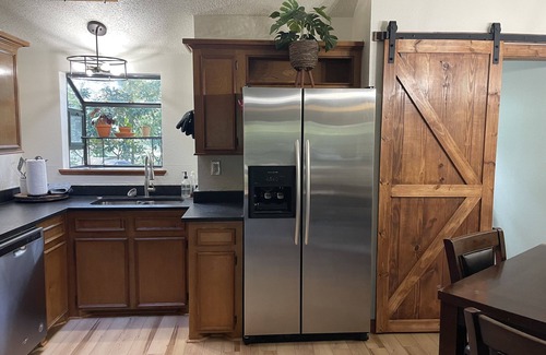 Fully Furnished Cedar Cabin resting on stilts among the trees with a huge front deck with patio furniture and a BBQ Grill. The back porch has furniture and overlooking the woods with hammock and creek. There is a Campfire Ring and Firewood provided for your roasting marshmallows and campfire enjoyment. A short hike about 1000 feet back to Lake Lewisville through the trails in the woods and a short walk or drive to West Lake Park. 1 mile to boat launch. 3 Bedroom 2 Bathrooms just remodeled rustic decor. Full kitchen with all the needed cooking supplies and spices and some sauces. Lot’s of board games, puzzles, Corn Hole and washers. It can be a short term rental daily weekly or monthly rental. Property is over 1 acre in the Lake Dallas Hickory Creek area. 1 Queen Bed 1 Full Bed and 1 Twin Bed that can be converted to King. With 2 decks with seating on both. New Central AC/Heat, New Windows, New Water Heater, New Floors, New Paint. WiFi, New 55 inch Flat Screen for Streaming, Washer and Dryer. Includes water, sewer, trash, internet & electricity. This property is part of the Lake Dallas RV Park.