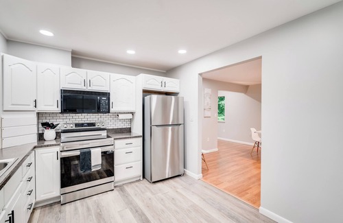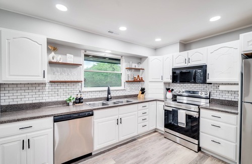 The completely remodeled kitchen is equipped with state-of-the-art appliances and features sleek countertops and cabinetry. It includes everything needed for culinary exploration, from a modern stove and microwave to a dishwasher for easy cleanup. The kitchen also boasts a large pantry, providing ample storage for all your cooking essentials. Guests have access to a full array of cooking tools including pans, pots, a slow cooker, and various utensils, ensuring that any meal, whether simple or elaborate, can be prepared with ease. Adjacent to the dining area, which features a charming Mable top table set for 6-8, there is a bar that offers additional seating. While the bar provides a stylish space for casual meals or socializing, please note that drinks are not provided, encouraging guests to bring their favorite beverages to enjoy during their stay.