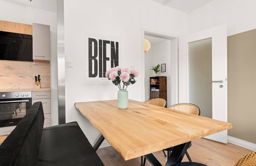 The heart of the apartment is the cozy living room with dining area and adjoining kitchen. Stylish furnishings and high-quality amenities make this apartment something very special.