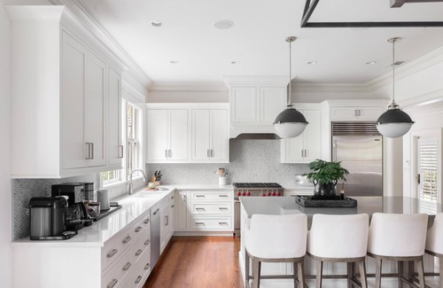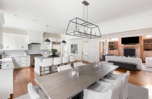 • Designer kitchen with high-end appliances, Wolf range, oversized island with seating for 4, and formal dining table for 6