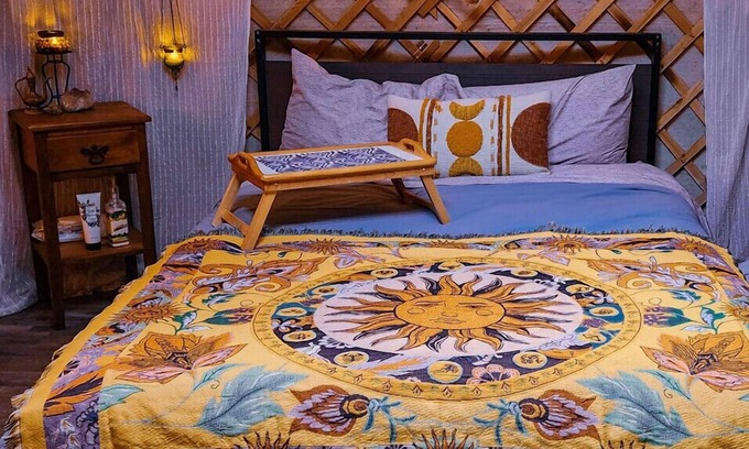 Enter through the colorful artisan crafted door and step into the quaint and cozy bedroom. Savor the quiet of the forest and take pleasure in some of the best sleep of your life. Enjoy the smell of yak fur as if you’ve been transported to the exotic land of Mongolia. Take a break from the hustle and bustle of the outside world while you allow yourself to unravel into the comfort of the scene around you.