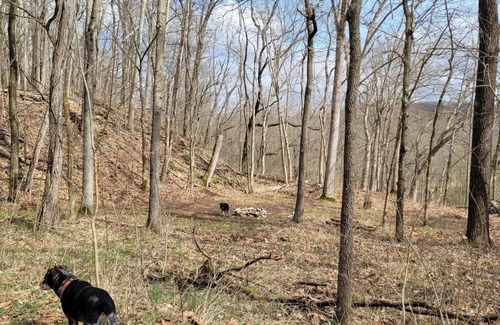 This wooded site is off the upper trail around the big quarry edge and overlooks the train tracks and the wetlands. This is a lovely, tranquil spot. Fire ring at site. Drive in to unload and load then park at street entrance. Only 8 camping sites on 18 acres with 100 acres of farm to explore. Common porta-potty and handwashing station, along with large communal fire ring, grill, and picnic table. Due to the drop overlook, this site is not suitable for children under 18 yrs.