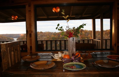 This rustic cabin is wonderfully decorated, boasting numerous antiques and furnishings constructed out of reclaimed timber, some from the old Jim Beam distillery in nearby Kentucky. All bedrooms feature luxury linens including 300+ thread count sheets, down comforters and pillows. Comfortably from any one of the three decks you can sun, grill, dine, enjoy music, soak in the hot tub while watching the sunset and stargazing. The (provided) telescope will give you a guided tour of the universe. The main living room has a 55" LCD TV with satellite TV, DVD player and a cozy fireplace. In the bonus room we have an additional 40" flat panel TV with DVD, wet bar and wifi internet. Just outside the bonus room is a free standing hand chiseled stone fire pit with wooden benches.