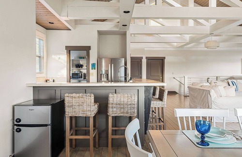 Kitchen: Fully equipped with stainless steel appliances, cooking necessities, coffee pot, dinnerware, flatware, and bar counter with stools