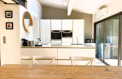 - Large, bright, air-conditioned living space with lounge, dining area, and kitchen (induction hob, refrigerator/freezer, oven, microwave, steam oven, Nespresso coffee maker, kettle, dishwasher) opening onto the terrace and pool