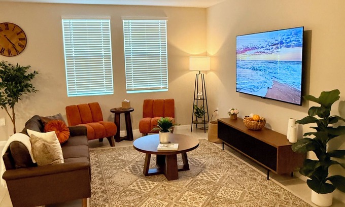 The open living area features a massive 75” TV, ideal for family movie nights after your exciting days at nearby attractions. The fully equipped kitchen and ample dining space provide everything you need to enjoy home-cooked meals together.