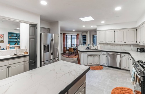 →Whip up meals in our well-appointed kitchen featuring modern stainless steel appliances, elegant white cabinetry, and sleek marble countertops. The open layout connects directly to the dining area, ideal for effortless entertaining. Bright and inviting, this kitchen is the heart of the home.