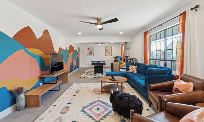 → Step into the vibrant charm of our New Mexico-inspired living room, featuring a stunning desert mural and a cozy mix of blue sectional sofa and elegant leather armchairs. Enjoy entertainment on the smart TV, or engage in some fun with the pool table, all bathed in natural light from the large windows. This space is perfect for relaxing and creating memorable moments with loved ones.