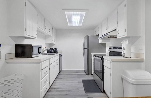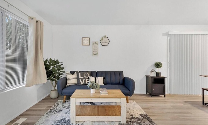 Entire family rambler with separate entrances, featuring 4 bedrooms, 4 bathrooms, 2 full kitchens with dish washers, and a landscaped backyard oasis in an upscale, well-kept neighborhood. This spacious retreat offers a practical layout with separate dining and living areas, cozy bedrooms with various bed options, en-suite baths (including 2 bathtubs), and both reserved and street parking. Accommodating up to 20 guests. Additional conveniences include in-unit washers/dryers, express check-in/check-out, keyless entry, fast WiFi, and Roku TV. Perfect for families and groups seeking a tranquil stay with easy access to city attractions, dining, and entertainment.