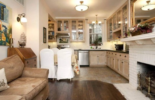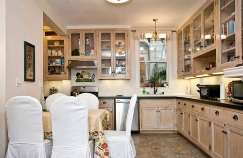 The kitchen is large, airy and well-stocked, with everything a cook could need, including a gas stove, a dishwasher, high quality pots and pans, and a set of real chef's knives. The bright and open living room has a dining table that can expand to seat 8, bay windows overlooking the garden, a large TV with Netflix and a DVD player tucked away in an antique armoire. The living room has a desk and printer, and a washer and dryer for your convenience. The bathroom has a tub/shower combo.