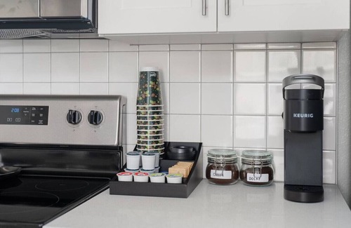 Step inside to discover a bright, open-concept living space thoughtfully furnished with sleek, modern decor and high-quality finishes. The fully equipped kitchen features stainless steel appliances, quartz countertops, and plenty of storage, while the cozy living area provides a welcoming spot to relax with a flat-screen TV and comfortable seating.