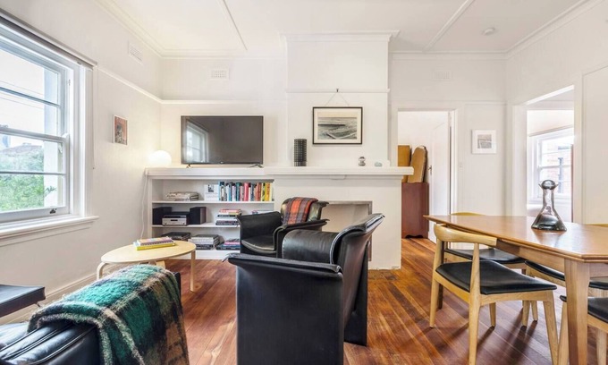 Settle into timeless style and warmth in this charming apartment. It's a three-minute walk to the tram and close to everything the city has to offer. Devour the generous book collection or simply relax in the sofas with an HDTV. A mix of vintage-inspired and mid-century pieces accents the art deco building, while the retro vibe is perfectly tied together with modern comforts such as air-conditioning and heating. Natural light flows through the apartment and there is a shared patio to enjoy.