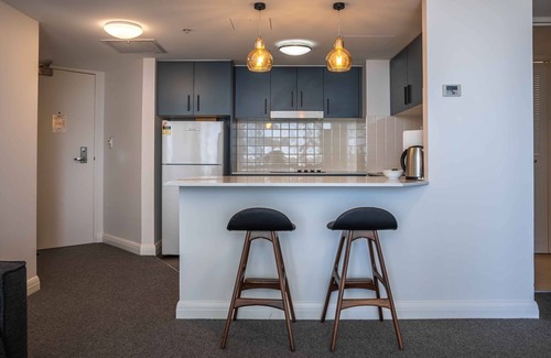 This sixth-floor apartment has the ideal layout for work and relaxation with its open living and dining area, private balcony and modern kitchen. It has an executive style and provides comfortable bedding, a bathroom with a shower bath and a breakfast bar for quick and efficient mornings or leisurely evenings.