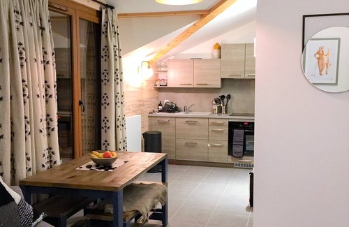 The open plan kitchen and living area have double opening doors that lead onto a south-west facing balcony, perfect for afternoon winter apres or summertime eating and relaxing.