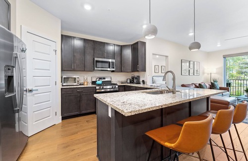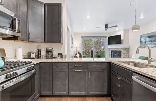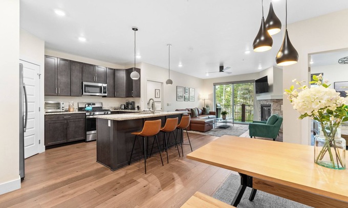 Upon entry, you will find yourself in the open-concept kitchen, dining, and living area. The full-size kitchen is stocked with all the essential cookware and tableware to enjoy a home-cooked meal. It also features stainless steel appliances, quartz countertops, and a large pantry. Additionally, this kitchen includes household favorites like a crockpot, a toaster oven, and more. Enjoy a cup of coffee on the private balcony as you take in the mountain air, this unit is stocked with a drip coffee maker and an initial supply of coffee. The dining table seats up to six and there is additional seating for three at the breakfast bar.