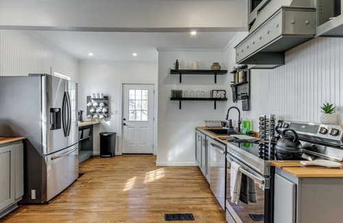 This historic home is newly remodeled with all the private comforts of your home away from home and is the perfect fit for large groups of all ages and needs. The first floor encompasses the cozy living area including lots of seating and a big screen TV for your entertainment needs. Additionally you will find a fully stocked kitchen and a large dining table that seats 8 comfortably and just off the dining a private full bathroom is found. Upon ascending the wide staircase, you will find all four bedrooms. Three bedrooms encompass four queen-size beds, while the fourth bedroom is comforted with a king bed and vanity with large mirror for getting ready. The second full bathroom is between bedrooms, which is where you will also find a stackable washer and dryer.