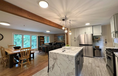Your experience at the cottage includes an array of luxurious amenities and features designed for relaxation and entertainment. Enjoy an open-concept living space ideal for gatherings, featuring a spacious kitchen, dining area, and inviting living room. With oversized masters boasting a king-size bed and spa-inspired bathroom, as well as comfortable guest rooms with queen beds, every detail ensures comfort for you and your guests. Take advantage of the games room for some friendly competition or unwind on the screened-in back deck while taking in the serene surroundings. Don't forget about the private waterfront just a short walk away, offering kayaks, paddle boards, and cozy seating, perfect for sunset celebrations and evening campfires under the stars.