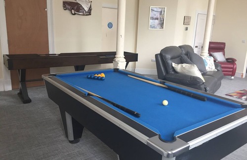 Imposing three story property just off the Eldon Square in the heart of Dolgellau. Ground Floor has two easy access en-suite bedrooms one being a disabled room with an electric bed. Dining to seat over 40 with french doors out on to an enclosed patio area with BBQ's and six picnic tables plus the option to set up and outdoor ping pong table. The fully fitted kitchen with everything you need for group catering. Two double ovens, twin hobs, three large fridge freezers and two dishwashers. Lounge has full Sky TV package with all the sports which can be directed through a projector. Loads of sofas plus a games area with a pool table, fussball and a shuffleboard table.