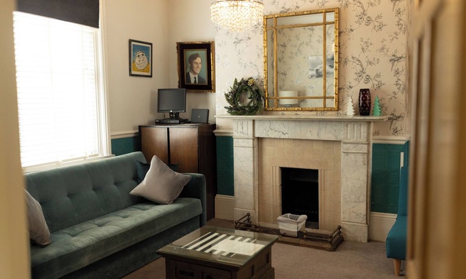 Elegant Living Spaces: The stylish living room, complete with plush furnishings and original features, offers a luxurious space for relaxation or casual celebrations during your wedding weekend.