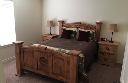 House has wood burning fire place, flat screen smart Samsung TV, master bedroom has pillow top king bed and a single bed as well, master bath has large walk in shower with two shower heads and a large Garden tub, bedroom 2 has a pillow top king bed and its own bathroom, bedroom 3 has a pillow top queen bed and its own bathroom, bedroom 4 has two bunk beds (4 singles) and uses 1/2 bath and shares one of the other bedroom baths for bathing. There is also another sleeping room with a large couch and bunk bed (double and single). There is also an outdoor fire pit, we don’t provide firewood so bring some or buy local, Charcoal or wood smoker, 2 fridges, water softener, 2 washers and 2 dryers, property is secure with 8' game fence with gated entry. Living room has sofa, love seat and large arm chair, recliner, dining area seats 6, dining bar seats 3. House has a large back porch that is shaded in the evening and faces wooded areas.