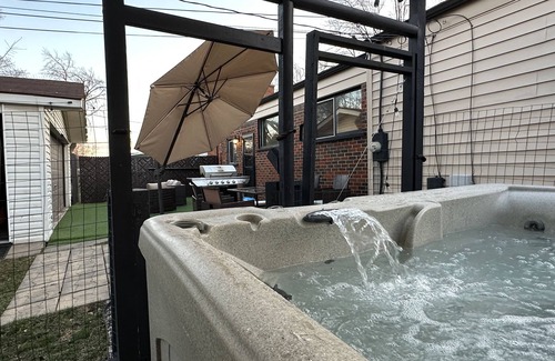 One of a kind cabin style home centrally located in metro Detroit. Luxury amenities, like the sauna, hot tub, towel warmers and indoor/ outdoor projector setup, along with cedar walls and a wood burning stove will make your stay unforgettable! High-end mattresses and a private fenced in yard and central location (Restaurants, bars, groceries and gyms within