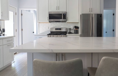 The kitchen has abundant cabinets, a luxurious Carrara marble island and fully equipped with new stainless steel appliances and Cuisinart coffee maker.