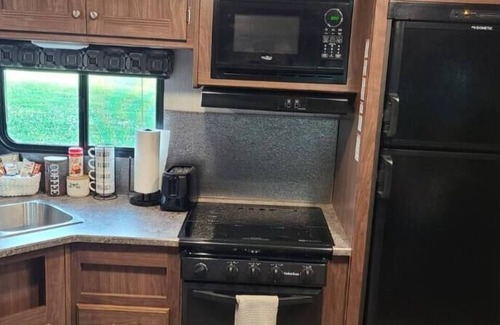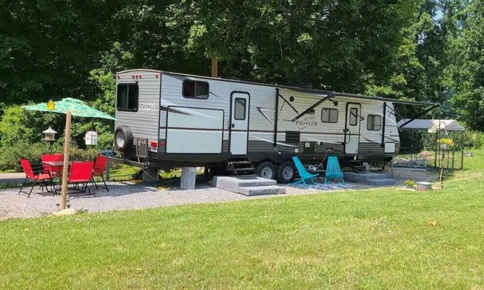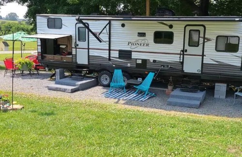 All the joys of RV camping without any of the hassle. This is a fully stocked RV located on over half an acre. Enjoy spending your family evenings next to the firepit while taking in beautiful mountain and picturesque farmland views. Take time to relax while sipping your morning cup of coffee on the outdoor swing. Peaceful country feel yet close to town. Central to historic Greeneville, Jonesborough, and Johnson City. We are pet friendly and provide an optional outdoor kennel for guest use.