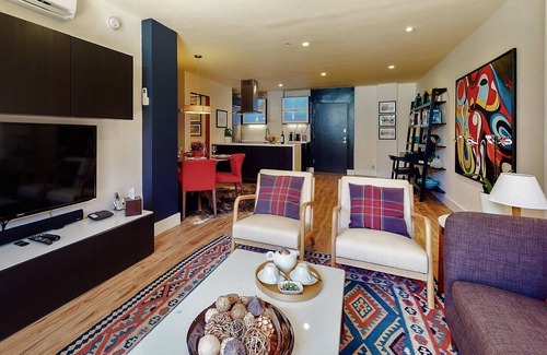 The large living room is tastefully designed with original art and modern style furnishings. The unit is equipped with Bluetooth enabled sound system, 42-inch LCD Sony television, Blu-ray DVD player, home theater surround sound system.