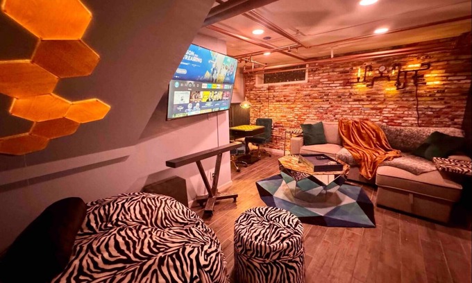 We have provided two opulent bedrooms designed for comfort, style, and ambience. Two Bean bags and one pull out sofa provided for your easement. Game table, arcade games, projector, multiple lighting options, and a portable high fidelity Dolby Atmos soundbar/subwoofer for your pleasure. Each room has been carefully designed and engineered for your enjoyment. We have provided a guest guidebook for your convenience to walk you through making the most of your experience!