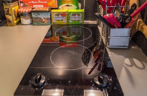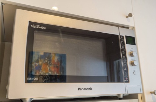 kitchenette with microwave, coffee maker, kettle, induction hob, washer-dryer