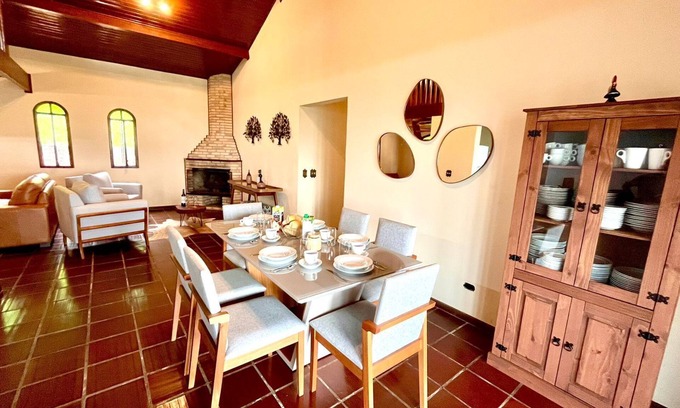 Chácara aconchegante em Atibaia, próximo de São Paulo, com acomodações para até 34 pessoas dividas em 4 Suítes e mais 3 dormitórios, Sala 3 ambientes com Lareira, Mezanino, Wi-fi na residência e uma ampla Varanda com redes e um confortável balanço. São 10mil m2 de área com muito verde, árvores frutíferas, espaço Gourmet com Churrasqueira e Forno à Lenha para Pizza, Piscina com cascata, Playground, Cama elástica, Lareira externa, amplo Gramado para você relaxar e se divertir com toda família e amigos!