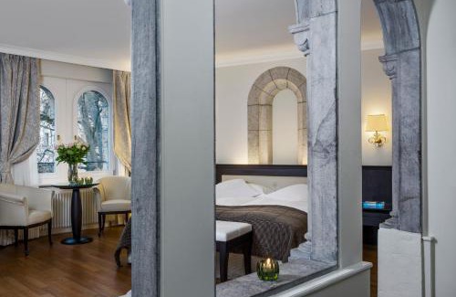 The Château d'Ouchy is a renovated medieval castle with an original donjon (keep) in a scenic location in Lausanne, directly on the shores of Lake Geneva. Guests can enjoy the restaurant 57° Grill, the cozy bar, the outdoor pool, the modern leisure area with sauna, hammam and a treatment room called "Le Boudoir" by flyspa, as well as the terrace facing the lake. Rooms are air-conditioned and feature a TV, seating area, mini-bar, and a bathroom with bathrobes and slippers.