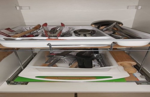 The kitchen is equipped with a stovetop and a refrigerator, as well as a microwave, cookware, and a blender. And you can even travel light because you'll have a washing machine.