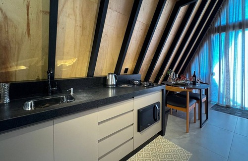 With accommodation for two people, the chalet has a bathtub overlooking the mountains, allowing you to relax and enjoy a panoramic landscape while taking an invigorating bath.