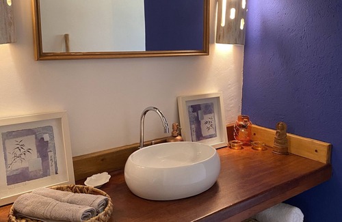 Chalé com dois quartos com cama de casal, sala grande com lareira interna e sofá cama para um hóspede, cozinha bem equipada e um banheiro charmoso e equipado, situado de frente para um rio, no lindo sítio Kailasa Zen Garden, onde pode se desfrutar de uma sauna de frente ao rio e excelente serviço de caseiro e cozinheira na área coletiva do Kailasa a apenas 20 metros de distância do Chalé Azul dos Budas. Nos jardins do Kailasa e à disposição de quem está no Chalé dos Budas, há um bangalô de yoga, estacionamento para até dois carros do Chalé, mais de 2 mil metros quadrados de gramado, mais 2 mil m2 de floresta nativa, bosques de palmeiras, coleções de orquídeas e bromélias, além de diversos decks de contemplação e para banho de Sol. Os jardins foram desenhados segundo a tradição japonesa Zen e sua iluminação a noite é belíssima. Lugar seguro e reservado para descanso e relaxamento com amigos e família. O caseiro pode ajuda los com churrasco se informado antes.