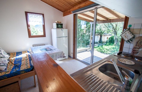 This chalet with a beautiful view is ideal for breakfast in the morning facing the rising sun with a covered terrace. This chalet was restored externally in 2018 (cladding). It has a kitchen with dining area, 2 bedrooms, 1 bathroom with shower and separate toilet. The price does not include bed linen (€ 10 per bed), towels, tea towels and optional air conditioning.