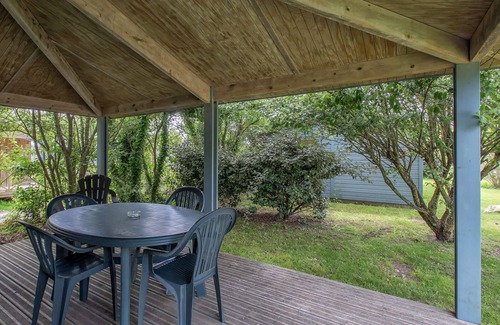 En extérieur, une grande terrasse couverte en bois, un jardin avec mobilier extérieur et emplacement de stationnement.