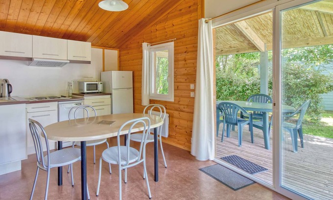 Dans un parc résidentiel de loisirs, joli chalet en bois se composant d’un séjour avec cuisine équipée, d'une chambre avec un lit double (140), d’une chambre avec 1 lit superposé et un lit tiroir (3x90), d’une salle d’eau avec cabine de douche et WC.