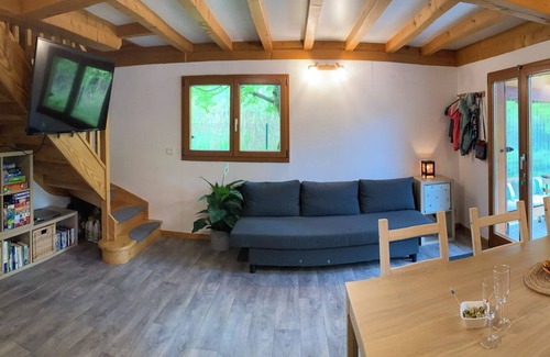 Chalet for 6-8 people completely renovated with a private garden located in Camping Sandaya la Nubliere 4*, Doussard, Lac d'Annecy being among other private chalets in a quiet location on the edge of Lake Annecy next to the reserve from Bout du Lac, with direct access to the lake.