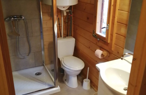 Installed on the terrace in a quiet oak undergrowth, perfectly integrated into their environment, this solid wood Bungalow, offer a warm and charming interior. Composed of 2 bedrooms (1 bedroom with 1 double bed, the other with 2 single beds), 1 bathroom (shower, sink, W. C), 1 living room (with sofa bed in the bungalows), 1 indoor kitchen or summer and a covered terrace.