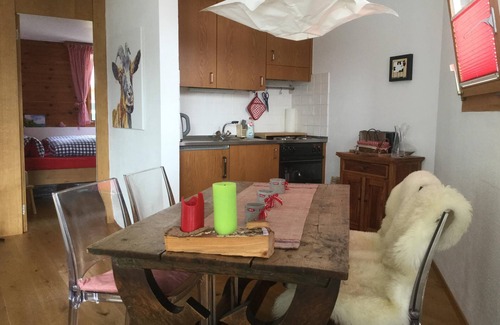 2 room with balcony, newly renovated apartment with real wood floor, ca 40 m², high quality and comfortable furnishings, in a quiet sunny location, south-facing balcony with spectacular views of the surrounding mountains, fully equipped kitchen, bedroom, living room with sofa bed for 1 additional person, Flatscreen TV, Internet (Wi-Fi), sauna for a fee (5 Fr./ Hr.) With Jacuzzi, shared use, underground parking, ski storage, washing machine and dryer in the house. Ski bus leaves every 15 minutes directly in front of the door in about 5 minutes. to the cable cars.