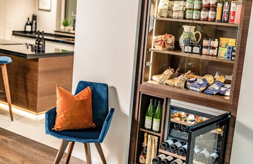 The wellness facilities are a true highlight: you have access to a private whirlpool and sauna as well as a 110 m² sun terrace. You can also use the shared infinity pool. The nearby resort offers its pool and wellness area with sauna, gym, and other amenities free of charge.