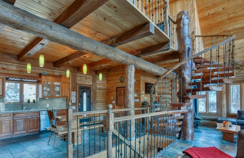 Beautiful construction custom built log home on a waterfront view, private lot ,within an hour drive from Montreal and 15 min drive to Saint-Sauveur. Close to ski slopes, shops, restaurants, supermarket, and bank. Equipped kitchen(with essentials)with granite counters, two story living-room with wall of windows overlooking the lake and opening to a gorgeous full length of the house deck. The basement and main level have beautiful slate flooring with heating underneath. It's a must see.