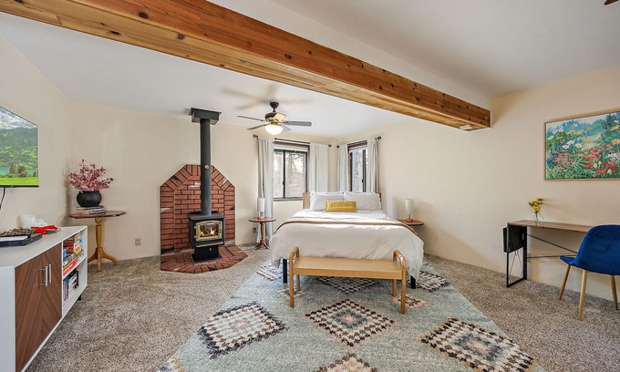 Escape to our inviting 650 sqft attached guest cabin, nestled amidst the serene forest. This cozy retreat features a spacious mixed use bedroom with living area seamlessly connected to a remodeled kitchenette, offering a perfect space for dining, and relaxing. Surrounded by windows, you'll enjoy breathtaking views of the treetops and the visiting wildlife, including deer and turkeys.