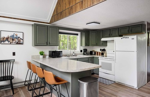 Amber Woods is a newly renovated cabin tucked away in the woods. Updated kitchen, large great room, with large swing seating and wood stove. Beautiful views throughout, perfect for stargazing or watching the snowfall. A great place for families or small groups of friends!